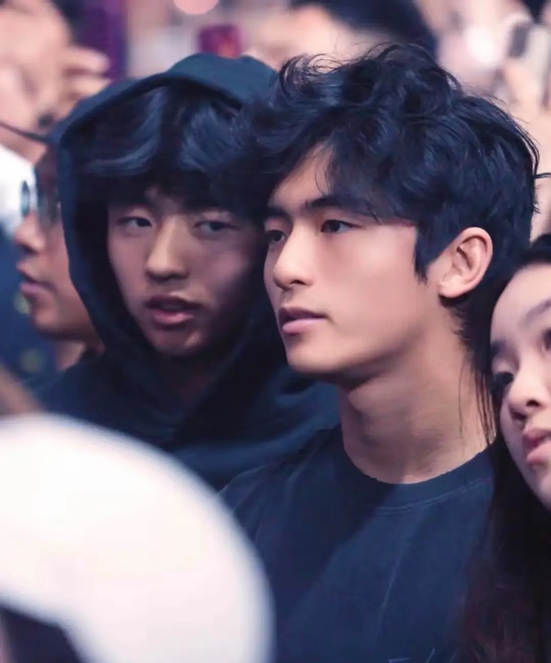 黑色卫衣、浅灰色阔腿裤、厚底的运动鞋,打扮得简约基础。而谢振轩的正脸冷峻犀利,神似谢霆锋。