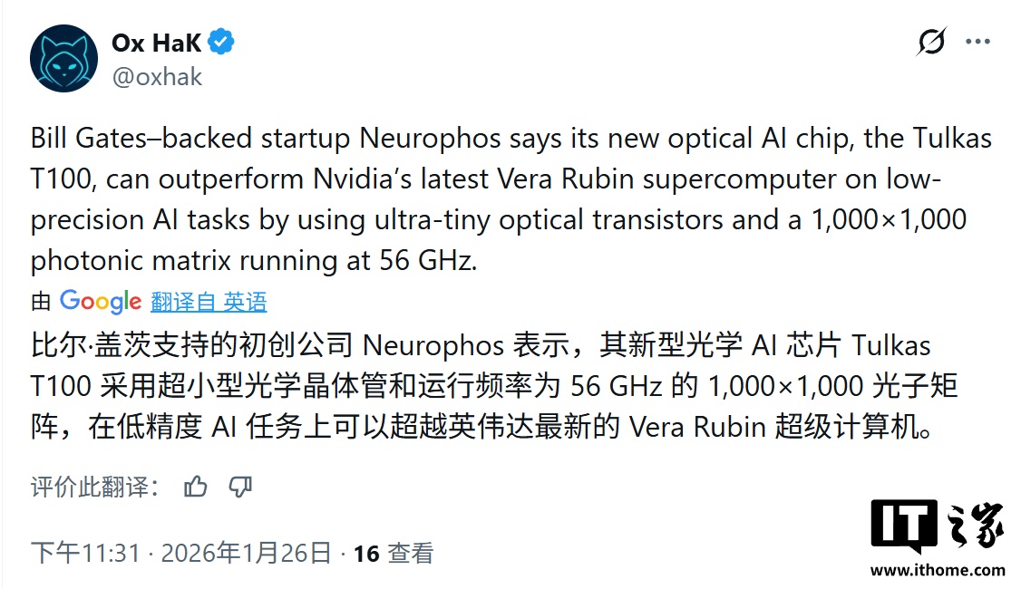 IT之家 1 月 27 日消息,科技媒体 Tom's Hardware 昨日(1 月 26 日)发布博文浩鼎中心,报道称比尔 · 盖茨投资的初创公司 Neurophos 宣布开发出首款光处理单元(OPU)Tulkas T100。